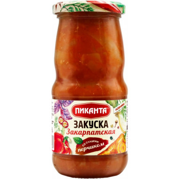 Закуска ПИКАНТА Закарпатская – в меру острое, пикантное блюдо на основе болгарского перца и моркови. Этот готовый гарнир может подаваться горячим, холодным или теплым, как самостоятельное блюдо, как дополнение к мясу или рыбе, или как закуска с хлебом или крекерами.