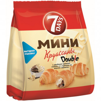 В ассортименте вкусы: Какао-Ваниль/Ваниль-Вишня. В фольгированном пакете флоу-пак содержатся приблизительно 8 мини-круассанов с двойной начинкой в каждом. Круассан 7Days - это классическое французское лакомство, приготовленное из слоеного дрожжевого теста и щедро наполненное восхитительной густой начинкой. Нежный, воздушный, легкий круассан идеально сочетается с любым напитком: утром с чашечкой кофе, в обеденный перерыв - с кружкой бодрящего чая, в дороге или на прогулке - с пакетиком сока. Специальная герметичная упаковка позволяет сохранить свежесть и мягкость выпечки в течение всего срока годности. Небольшие упругие круассанчики не крошатся, не мнутся и не ломаются. Они с честью донесут свою двойную начинку до вас и вашей компании. Вы можете быть уверены в качестве 7Days - они выпечены идеально.