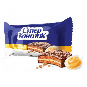 Два печенья со вкусом сгущенного молока соединены нежным шоколадно-сливочным кремом и залиты шоколадной глазурью.