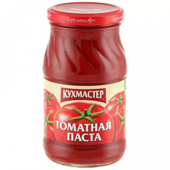 В составе томатной пасты нет ничего лишнего, только плоды томатов и немного сушёных приправ. У пасты однородная консистенция, достаточно густая, естественного бордово-красного цвета.