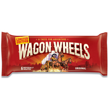 Печенье бисквитное Wagon Wheels суфле с джемом и глазурью — это две пластинки хрустящей бисквитной выпечки в глазури из молочного шоколада, с прослойкой из молочного суфле и ягодного джема.