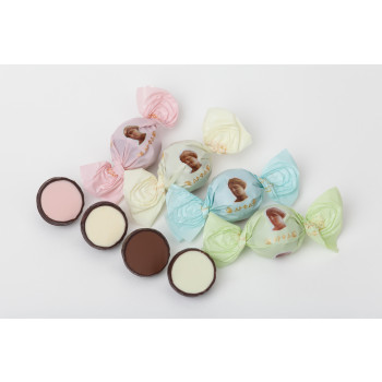Конфеты мини-купольной формы в фирменной тёмной глазури с нежной светлой начинкой с добавлением измельчённой леденцовой карамели со вкусами: «Ананас», «Лесные ягоды», «Черника», «Клубника»