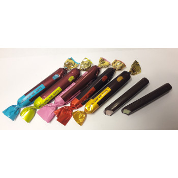 Конфеты в форме палочек в фирменной темной глазури с темной начинкой, со вкусом: "Амаретто", "Бренди", "Коньяк", "Ром".