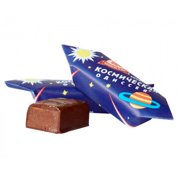 Конфеты 'Космическая одиссея' — одни из самых знаменитых конфет концерна 'Бабаевский'. Плотная начинка из тающего во рту темного шоколадного крема, покрытая шоколадной глазурью. Яркий алкогольный аромат переплетается с насыщенным шоколадным вкусом, в основе которого — нежная мягкая сладость. Конфеты хороши и сами по себе, и в качестве дополнения к кофе и чаю. Состав: шоколадная глазурь (сахар, какао тертое, эквивалент масла какаорафинированные дезодорированные, фракционированные, негидрогенизированные растительные масла (пальмовое, ши)), какао-порошок, эмульгаторы: лецитин соевый, Е476, ароматизатор 'Ваниль'), сахар, какао тертое, масло какао, сгущенное с сахаром молоко (цельное молоко, сахар), сухое цельное молоко, патока, спирт этиловый ректификованный (2,8%), коньяк (1,6%), вода питьевая, эмульгатор лецитин соевый, антиокислитель аскорбиновая кислота, ароматизатор 'Ванильно-сливочный'. Противопоказано при индивидуальной непереносимости белка молока.